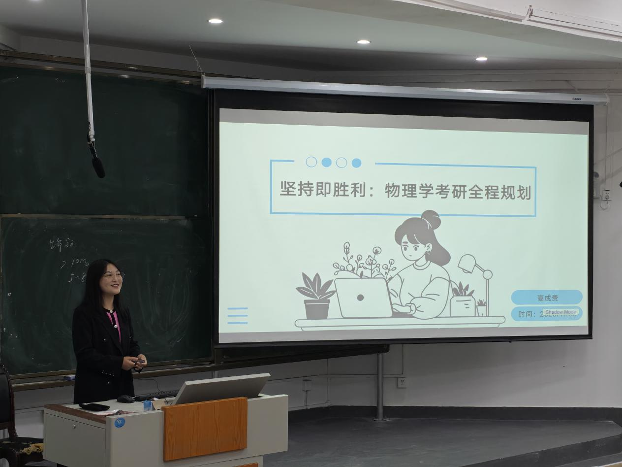 2025年11月5日上午,物电学院在宁静楼435教室成功举办“坚持即胜利:物理学考研规划”专题讲座。本次讲座由高成贵老师主讲,2023级物理学专业全体学生参加,物电学院岳天天老师主持。 高成贵围绕考研初心、成功要素、学硕与专硕区别、复习规划及心态调整等核心内容展开,为有志于考研深造的学子提供了系统性指导,现场互动热烈,学生收获颇丰。 高成贵指出持续学习超过10个月、日均有效学习6小时以上,上岸率可超过80%,并进一步强调了坚持与方法的重要性。针对物理学考研的两大方向——学术型硕士(学硕)与专业型硕士(专硕),详细对比了两者的区别、分析了两种选择的适合对象、考试科目及各自的优势与挑战,帮助同学们根据自身目标做出合理选择。最后,高成贵老师详细讲解了考研复习的三个关键阶段:基础阶段、强化阶段、冲刺阶段,针对英语、高数(一)、专业课等核心科目,提供了具体的复习方法以及公共课与专业课的优质资源清单,帮助同学们高效利用时间,精准复习。针对备考过程中常见的心态波动,高成贵老师给出了实用建议:制定小目标并打卡,每完成一项打勾,逐步建立信心;适度运动,缓解压力,保持身心健康;避免盲目比较,专注自身节奏,减少焦虑。她以温暖的话语鼓励同学们:“坚持终将遇见理想的自己!” 通过本次讲座,进一步帮助备战考研的同学明确了考研目标,理清了复习思路,不再迷茫,助力学子在科研与职业道路上走得更远、更稳。 图文/刘家兴 何莉娜拉 一审/岳天天 二审/蔡晶 三审/刘高福
