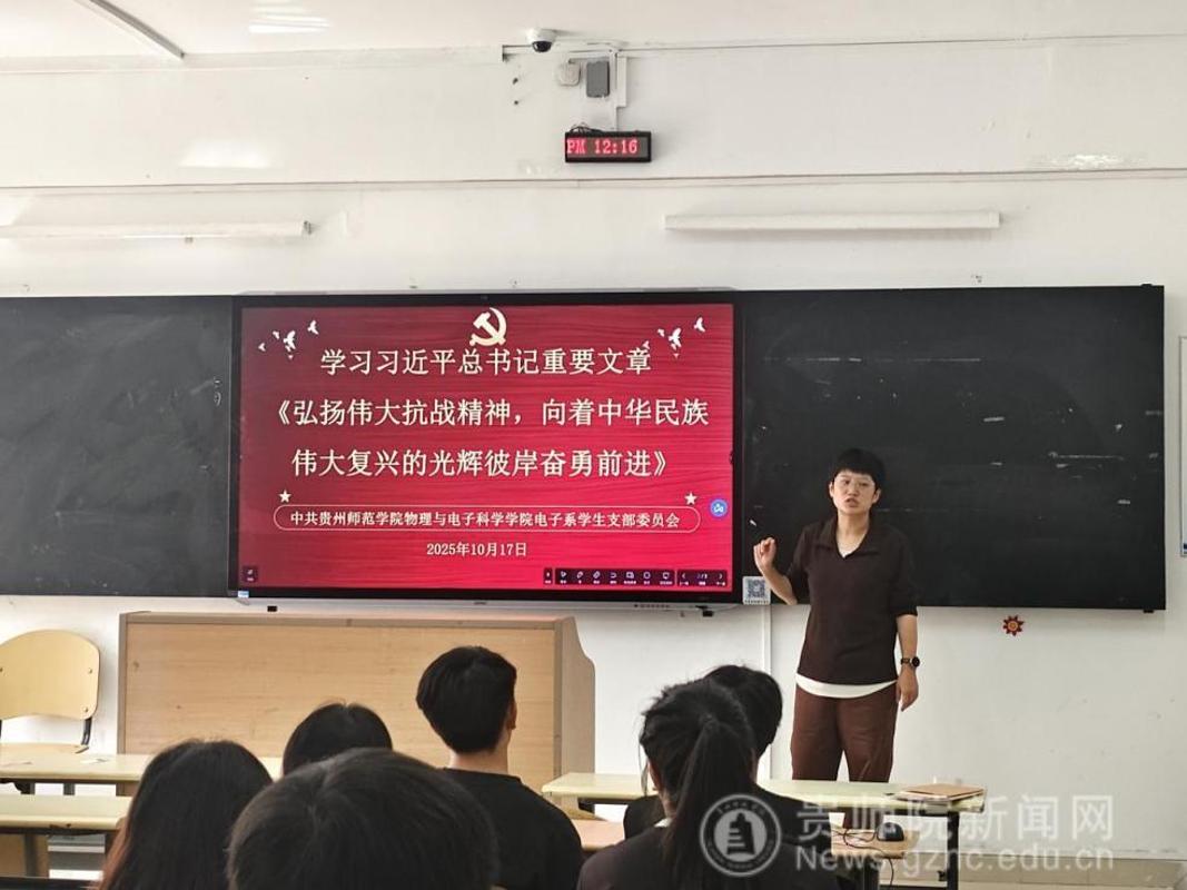 2025年10月17日中午,贵州师范学院物理与电子科学学院电子系学生支部在宁静楼427教室组织开展以“烽火铸魂——从抗战精神到新时代学风建设的传承之路”为主题的党日活动。本次活动聚焦学习习近平总书记重要文章《弘扬伟大抗战精神,向着中华民族伟大复兴的光辉彼岸奋勇前进》以及其在纪念中国人民抗日战争暨世界反法西斯战争胜利80周年大会上的讲话精神。活动由支部书记李荔主持,支部全体党员参加。 活动伊始,李荔同志围绕习近平总书记重要文章《弘扬伟大抗战精神,向着中华民族伟大复兴的光辉彼岸奋勇前进》展开,详细解读了文章的核心要义,强调了抗战精神在新时代的深远意义。然后认真学习了习近平总书记在纪念中国人民抗日战争暨世界反法西斯战争胜利80周年大会上的讲话精神,引导大家深刻领会历史教训与时代使命。 在交流环节,支部党员结合自身学习与生活实际,踊跃发言。有党员同志表示:“抗战精神是中华民族的宝贵财富,作为新时代青年,要传承和发扬这种精神,以坚韧不拔的意志投入到学习和科研中。”入党积极分子也积极表态,将以此次学习为契机,不断提升自身政治素养,争取早日加入党组织。