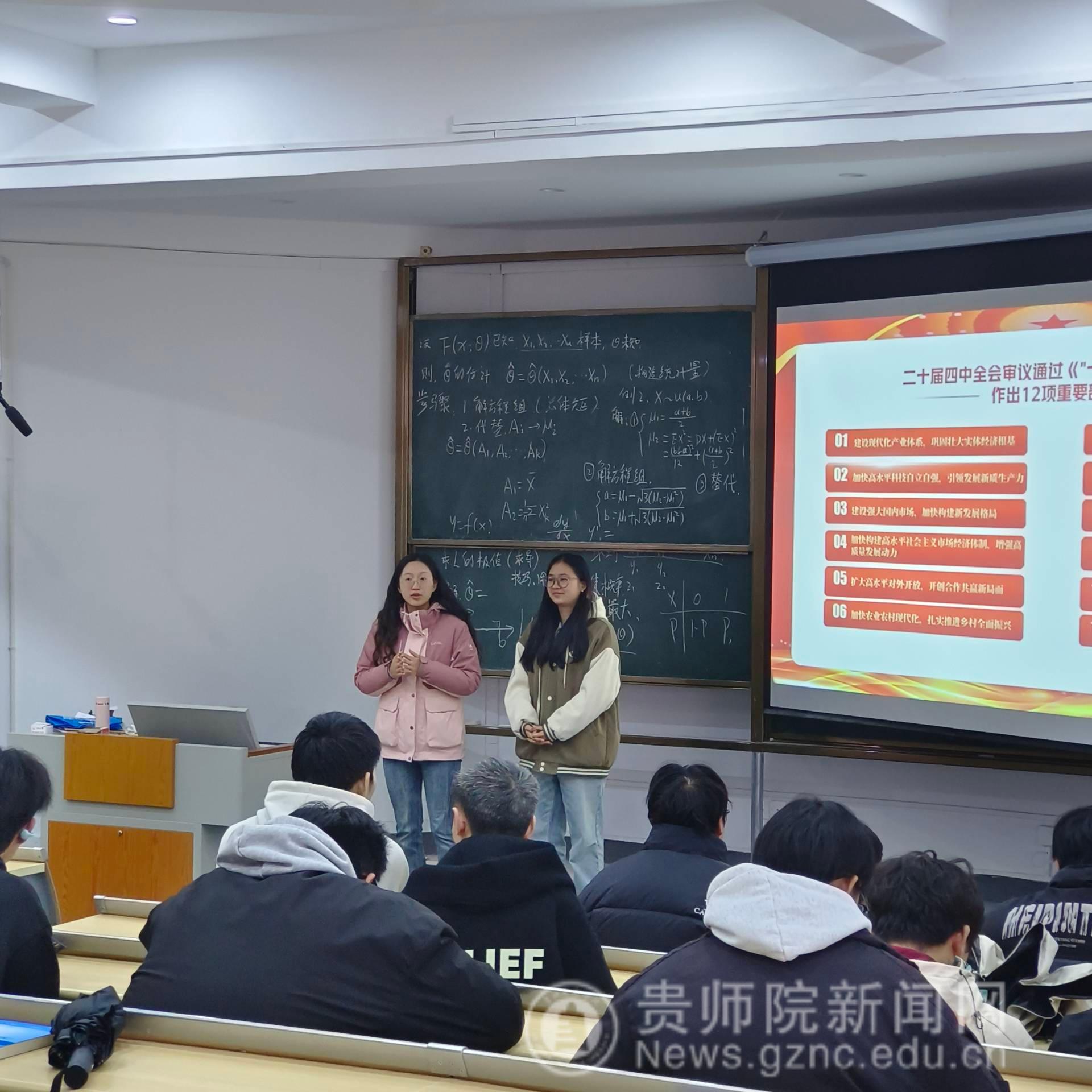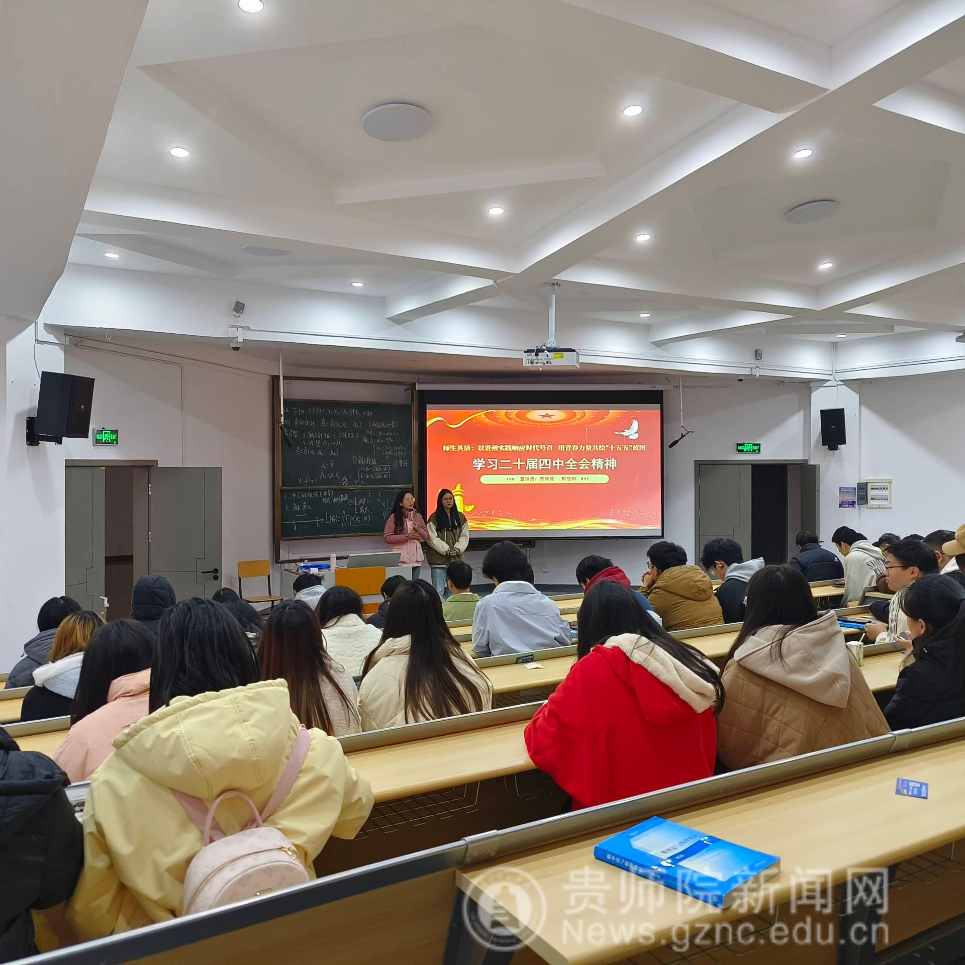 2024年12月4日,物理与电子科学学院在宁静楼437教室举办了学习贯彻党的二十届四中全会理论宣讲活动。学院团委副书记苏诗媛与2024级彭佳和同学采用“理论宣传二人讲”形式,围绕党的二十届四中全会审议通过的“十五五”规划建议,结合贵州发展实际和大学生生涯规划展开了生动宣讲。 宣讲会聚焦“加快高水平科技自立自强”、“扎实推进乡村全面振兴”、“激发文化创新活力”三大主题,通过政策解读、案例分析和互动讨论相结合的方式,将宏观政策转化为青年学生易懂易行的实践指南。活动现场气氛活跃,近百名学生参与交流。 苏诗媛首先系统解读了党的二十届四中全会的基本精神和“十五五”规划建议的核心要义。她指出,“十五五”时期是我国夯实基础、全面发力,为实现社会主义现代化奠定坚实基础的关键时期她列举了贵州在“中国天眼”、大数据综合试验等方面的建设成就,表明贵州已从“西南腹地”转变为“技术高地。彭佳和同学从学生视角分享了学习体会:“作为物电学院学子,我们应主动对接国家战略需求,将个人专业方向与贵州发展需要紧密结合,在科研学习中践行‘科技自立自强’的使命担当。”在乡村振兴板块,苏诗媛解读了“十五五”规划建议中关于“加快农业农村现代化”的部署,彭佳和分享了贵州“村超”、“村BA”等特色乡村文化活动的成功案例。在“激发文化创新活力”部分,苏诗媛指出,“十五五”规划建议强调要“激发全民族文化创新创造活力”,大学生是文化创新的生力军。她鼓励同学们结合贵州多民族文化资源丰富的优势,积极参与民族文化创意产品设计、非遗传承与保护等项目。 本次宣讲采用“师生对话、一人理论解读、一人案例补充”的双人宣讲模式。 这种理论阐述与典型案例相结合的方式,使抽象政策变得直观可感。活动现场还设置了问答互动环节。针对学生提出的“大学生如何参与乡村振兴”问题,宣讲人建议可结合专业特长,参与乡村数字化建设、远程教育帮扶等项目,在服务乡村中实现自我价值。宣讲结束后,参会学生纷纷表示,这种贴近实际、贴近生活、贴近学生的宣讲方式,使他们对国家政策与个人发展的关联有了更清晰认识,增强了投身贵州高质量发展的信心和决心。