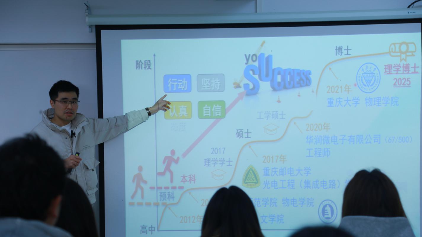 为充分发挥优秀校友的示范引领作用,帮助在校学生明晰成长方向、激发奋进动力,促进学生就业,11月29日,物理与电子科学学院、印山芳华辅导员工作室邀请物电学院2017届物理学专业毕业生、重庆大学2025届博士研究生毕业生、现重庆电子科技职业大学教师陈爱回校为物电学院学生开展“学长领航·青春榜样·筑梦未来”成长经验分享会,分享会由物电学院专职辅导员、印山芳华辅导员工作室主持人雷仕娜主持,物电学院大一、大三、大四学生代表参加了分享会。 分享会中,陈爱从个人成长经历、备战考研建议、考研关键提醒等三个方面展开分享。首先,分享了自己从进入贵州师范学院预科生学习到现在博士毕业顺利就业十三年间的成长发展经历,强调“行动、坚持、认真、自信”对于我们个人追求进步道路过程中的重要性。行动,是打破犹豫与焦虑的利器,是梦想照进现实的第一步。坚持,就是在面对困难时不轻言放弃,在遭遇挫折时仍选择前行。坚持,是在日复一日的平凡中守护初心,在低谷与瓶颈期依然选择向前。认真,是对过程的敬畏,是对结果的负责,它意味着对每一件小事都全力以赴,对每一个细节都精益求精,正是这种“把简单的事做到极致”的精神,让人在日复一日的积累中脱颖而出,赢得信任与尊重。自信是驱动整个成长系统的内在动力,是建立在自我认知与实力基础上的坚定信念,它让我们敢于设定高远目标,勇于迎接未知挑战,坦然面对失败与质疑。他强调:在追求进步的过程中,我们要勇敢试错、不断迭代。这四个品质,缺一不可:没有行动,一切只是空想;没有坚持,努力半途而废;没有认真,成果浮于表面;没有自信,脚步畏缩不前。四者合一,便构成了我们个人成长的“黄金四角”。 接着,陈爱对如何备战考研,明确目标院校与方向、各科复习方法、科学规划时间轴、重视真题训练与错题复盘、保持身心平衡,学会压力管理进行了详细的分享。他提醒学弟学妹们结合兴趣提前锁定目标院校与方向,密切关注时政及院校官网实时信息,避免因准备不充分落榜。同时,他指出备考需兼顾身心健康与情绪管理,核心仍是坚持。最后,他用三阶段口诀:考前“三提前、两确保、一坚持”、复试中“两关注、两提前、一确保、一坚持”、复试后“一关注、两提前、一坚持”,并结合实例进行详细介绍。 分享结束,学生们进行了交流提问。提问环节气氛热烈,同学们围绕备考、择校、学习方法等踊跃提问,陈爱耐心解答,雷仕娜老师适时补充。学长特别建议备考时找一个可信赖的“学习搭子”,可相互监督、相互鼓励,有效缓解备考中的压力、提升学习效率。他也给予学弟学妹们祝福,希望大家通过自己的努力,顺利考取自己心仪的院校。 本次分享内容详实、干货满满,陈爱学长的亲身感悟与实用建议为物电学院学弟学妹们的学业、考研与就业之路提供了宝贵参考,未来,物电学院、印山芳华辅导员工作室将持续开展“朋辈领航”育人品牌系列活动,为学生搭建校友与在校生的常态化交流平台,推动“传帮带”机制走深走实,让榜样的力量薪火相传、生生不息。 文/熊彬富 图/廖仕享 初审:雷仕娜 复审:吴丽 终审:熊德永