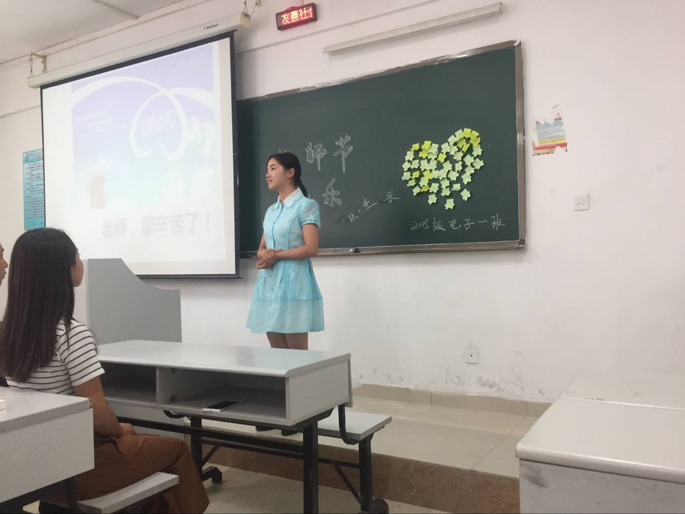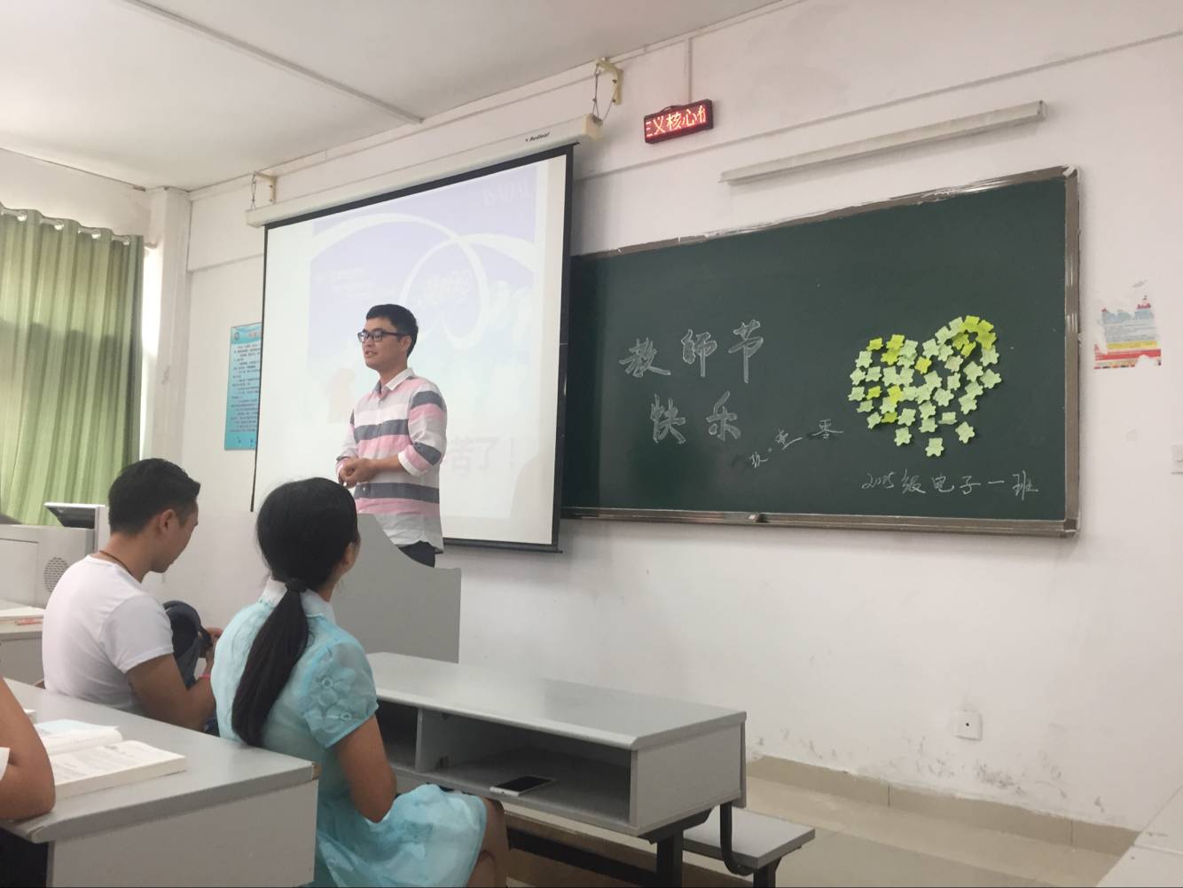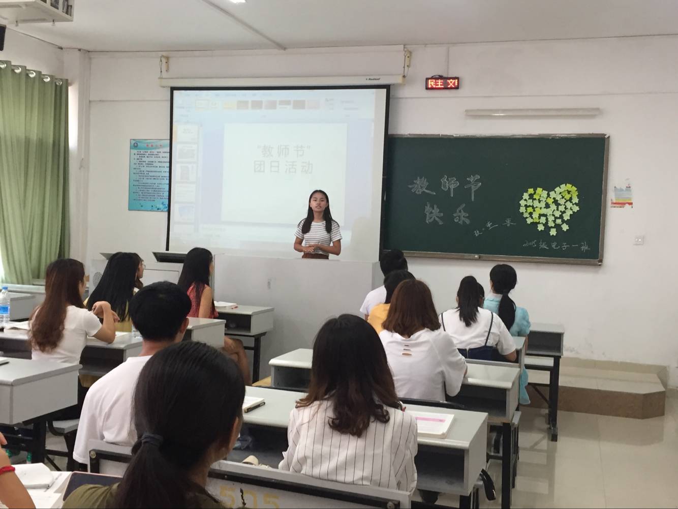 在第33个教师节到来之际,物理与电子科学学院2015级于9月8日在宁静楼429举行了关于“温馨教师节,浓浓师生情”的团日活动。出席本次活动的有辅导员楚亚萍老师、班主任莫章洁老师。 首先,团支书带领大家一起了解教师节的来源,以及中外名家对教师这个职业的评价等。接下来同学们主动分享在读书生涯中,对自己影响最深的老师、最爱的老师以及理想中的老师。大家都争先恐后的分享心目中的好老师形象,有的是因为老师曾经对自己帮助和鼓励比较多而喜爱,有的是因为老师上课风格而喜爱,而有的则是老师对自己生活的关心而印象深刻。 活动最后,楚亚萍老师和莫章洁老师,分别给同学们分享他们作为一名教师的经验和感悟,希望同学们积极进取,现在努力做一名老师心目中的理想好学生,将来做一名同学们心目中的理想好老师。同时鼓励同学们借此契机认真分析自己的职业梦想,积极地为考教师资格证做好准备。 (图/张梅 文/路萍 楚亚萍)