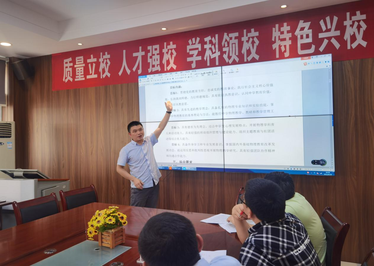为了推进物理学专业师范认证相关工作,2022年6月18日,物理与电子科学学院邀请重庆评估院田鹏飞博士莅临我院指导。教务处处长邓琴、教学质量检测与评估办公室主任任翠娟、学院基层党委书记熊德永、副书记于治鳞、副院长陈德良、刘高福及全体教师参加了会议。会上田鹏飞博士对我院参与师范认证的热情做了充分的肯定并对认证工作提出了具体建议。一是要继续深入学习《师范类专业认证工作指南》及相关文件,全面了解和准确把握师范类专业认证的概念与内涵,熟悉师范类专业认证工作的原则与要点。二是加大毕业生调研力度。要充分了解用人单位对我院毕业生在教学和班级管理等工作中的满意度并在教学过程中不断改进,使其培养的师范毕业生能够持续满足基础教育改革发展需求。三是对物理学专业师范认证工作方案的实施路径、各项指标进行具体指导。 教务处处长邓琴、教学质量检测与评估办公室主任任翠娟对我院的认证工作也提出了新的要求,一是要求我院全体教师必须要高度重视此次师范认证工作并以此为契机,推动专业内涵建设,改革培养体制机制,建立基于产出的持续改进质量保障和质量文化机制,不断提高师范生能力的培养。二是尽快落实田博士提出的意见和建议,全院上下一盘棋,全员参与,协同推进师范类专业认证工作的顺利开展。